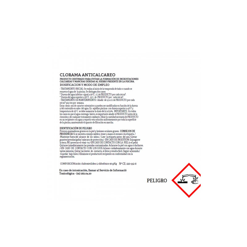 CLORAMA ANTICALCÁREO. Producto dispersante e inhibidor, mediante el cual se eliminan y evitan las incrustaciones, también ayuda a prevenir la obstrucción de los filtros y la corrosión de las partes metálicas del sistema de recirculación y filtración.