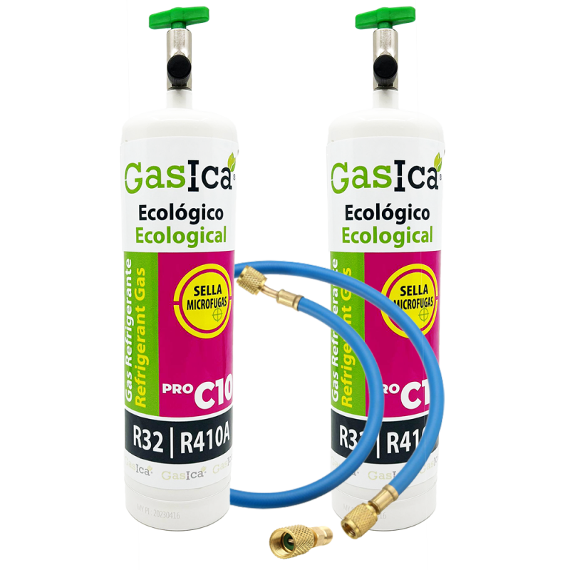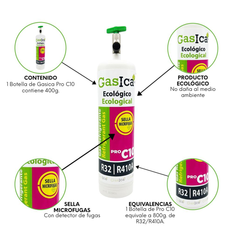 -Gasica C10 PRO DETECTA y SELLA MICROFUGAS que pueda tener en su AA. Para fugas más grandes asegúrese de haberlas reparado antes de hacer la recarga de su aire acondicionado. Podrá detectar la fuga gracias al pigmento verdoso que verá salir de la fuga de su aire acondicionado.