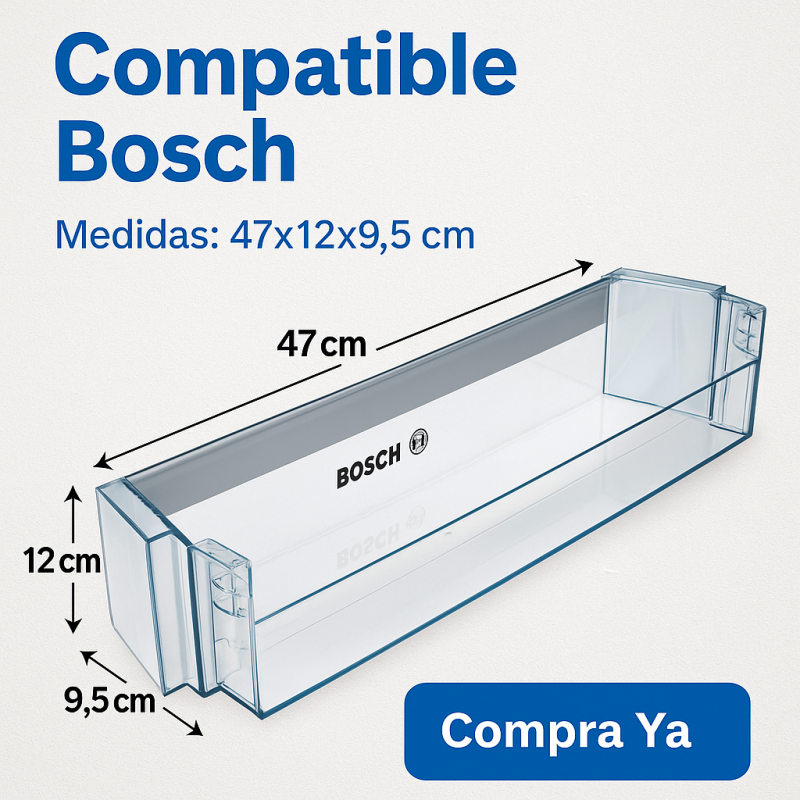 Renueva el almacenamiento de tu frigorífico con el estante botellero original Bosch, diseñado específicamente para ofrecer máxima estabilidad y organización en el compartimento de la puerta. Este repuesto permite almacenar botellas y recipientes de forma segura, evitando derrames y optimizando el espacio disponible.